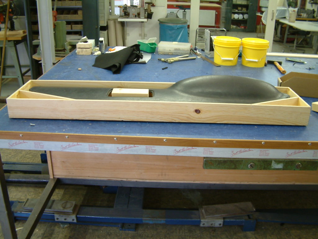 At the workshops of Bart Holland, after thorough study in the Library, the decision was made to again cast the dashboard with a soft foam layer, just like the original. The old dashboard was reinforced and made into the right size so that it could be used as a mould.